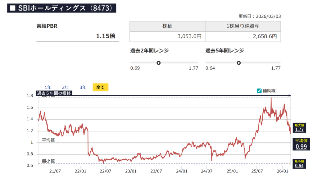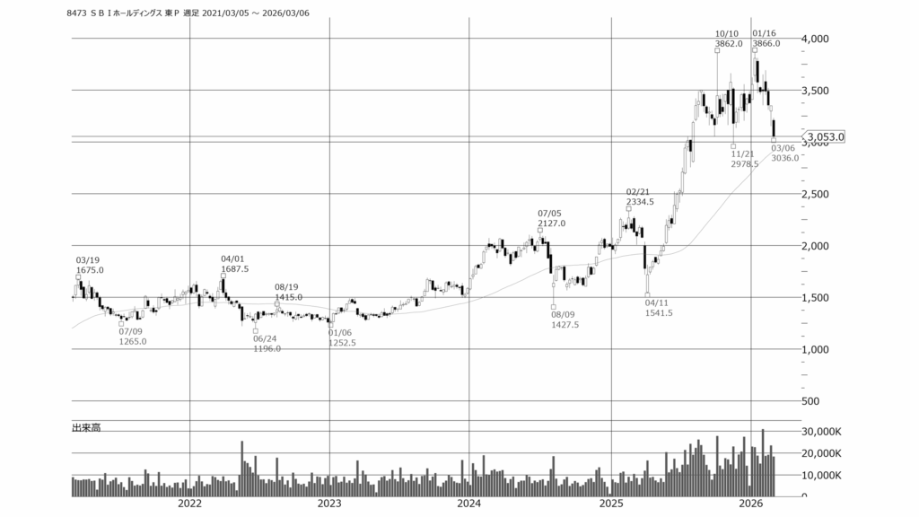 - 2023年頃までは1,000円〜1,500円台のレンジで推移していましたが、その後は力強い上昇トレンドへ転換。これは、新NISA制度の開始によるSBI証券の売買代金の増加、さらにSBI新生銀行の完全子会社化による「第4のメガバンク構想」の進展が、市場から資本効率の劇的向上と評価された結果です。