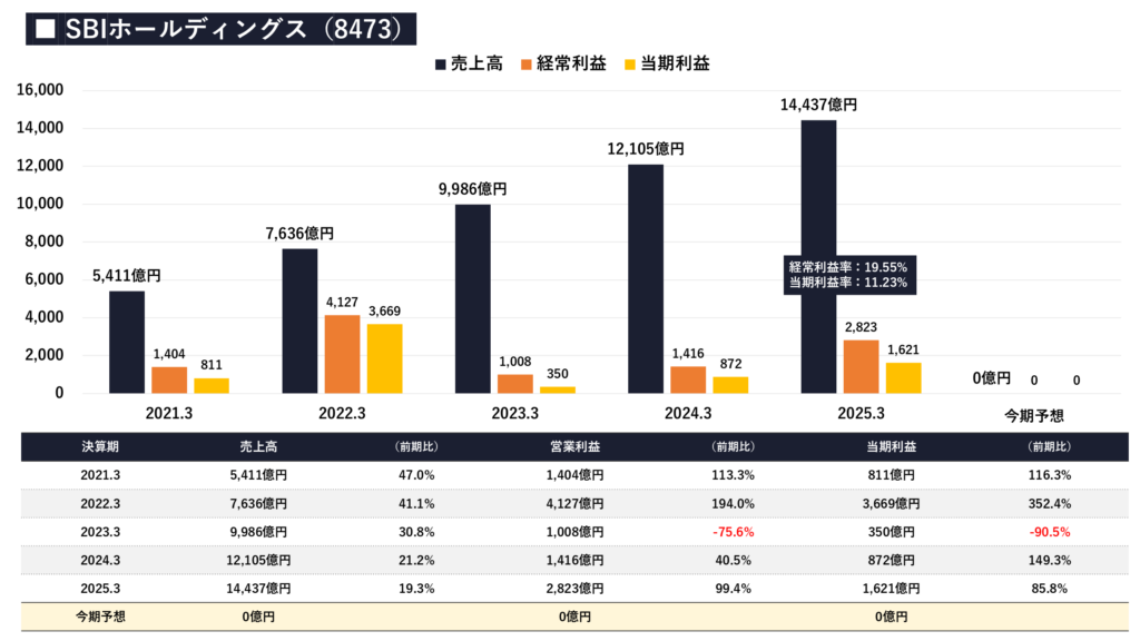 - 売上高(収益)は2021年3月期の5,411億円から2025年3月期の1.4兆円超へと、わずか数年で驚異的な右肩上がりを記録しています。これは、新NISAを追い風とした証券事業のシェア拡大に加え、SBI新生銀行の連結化、さらに地銀連合との提携による「金融生態系」の拡大が実を結んだ結果です。