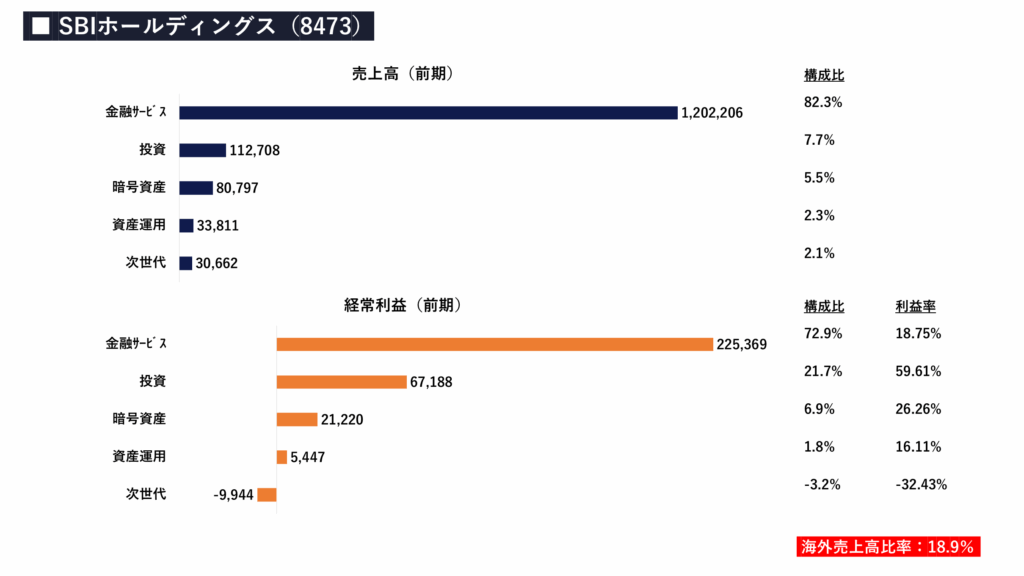 - SBIの真髄は、証券や銀行を擁する「金融サービス事業」が売上の約82%、経常利益の約73%を稼ぐ強固な基盤にあります。ここで得た資金を元手に、有望なベンチャー企業等へ出資(VC)する「投資事業」で約60%という驚異の利益率を叩き出しています。