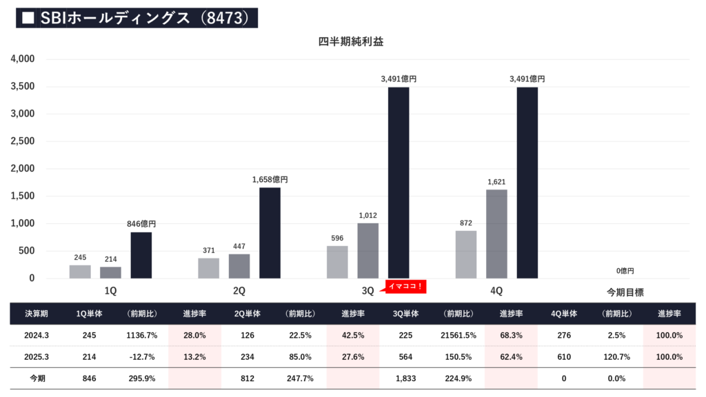- しかしこの躍進は、新NISAによる証券部門の好調や、金利上昇に伴うSBI新生銀行の収益化という「本業の強固さ」が見事に噛み合った結果です。通期目標は非開示ですが、最高益の更新への期待が確信に変わる圧倒的な3Qまでの推移と言えます。