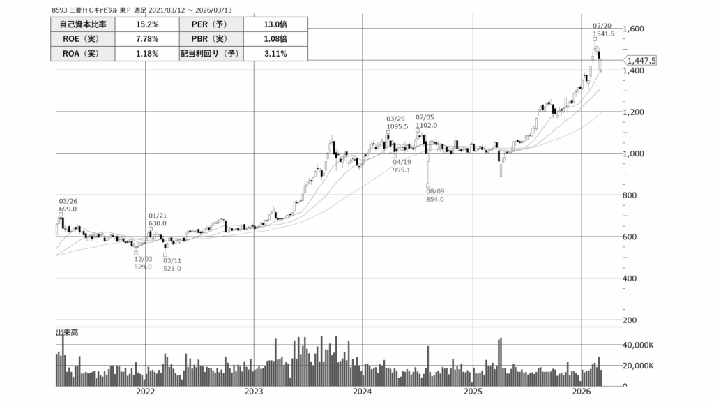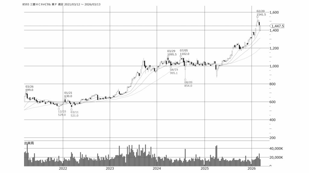 - 直近では2026年2月に1,541円の高値を付けた後、現在は1,447円付近で推移しています。短期的な調整は見られますが、下値を切り上げる展開が続いており、長期的な成長期待は依然として高い状態を維持していると評価できます。