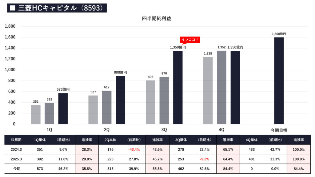 - 第3四半期(3Q)累計の当期純利益は1,350億円となり、通期目標1,600億円に対する進捗率は84.4%と非常に好調です。前年同期(進捗率64.4%)と比較しても、今期は早いペースで利益を積み上げていることがわかります。リース事業の特性上、極端な季節変動は少ないものの、想定を上回る航空セグメントの好調や、海外事業の堅調な推移が業績を押し上げていると考えられ、通期目標の上振れ(上方修正)への期待も十分に持てる力強い進捗状況と言えます。