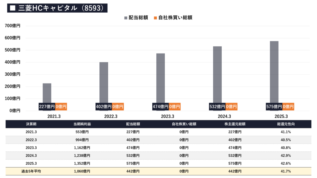 - 直近5年間の株主還元を見ると、自社株買いは行わず、配当による還元に特化しているのが特徴です。配当総額は2021年3月期の227億円から、2025年3月期には575億円へと着実に増加しています。総還元性向(配当性向と一致)は毎年40〜42%台で安定して推移しており、会社の方針である「利益成長を通じて配当総額を持続的に高めていく」というコミットメントが有言実行されています。配当という目に見える形での還元姿勢は、高配当株投資家にとって非常に大きな安心感に繋がります。